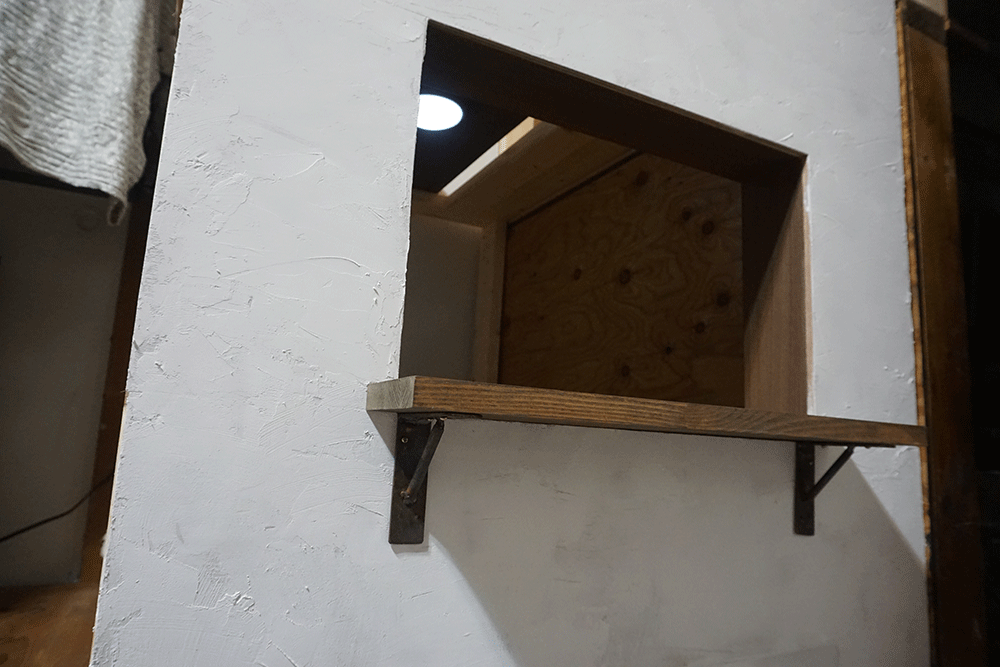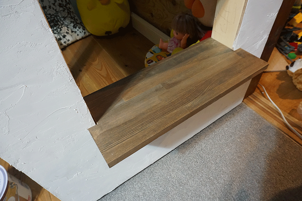 正面にくりぬいた窓には、カウンター風の出板を付けます。