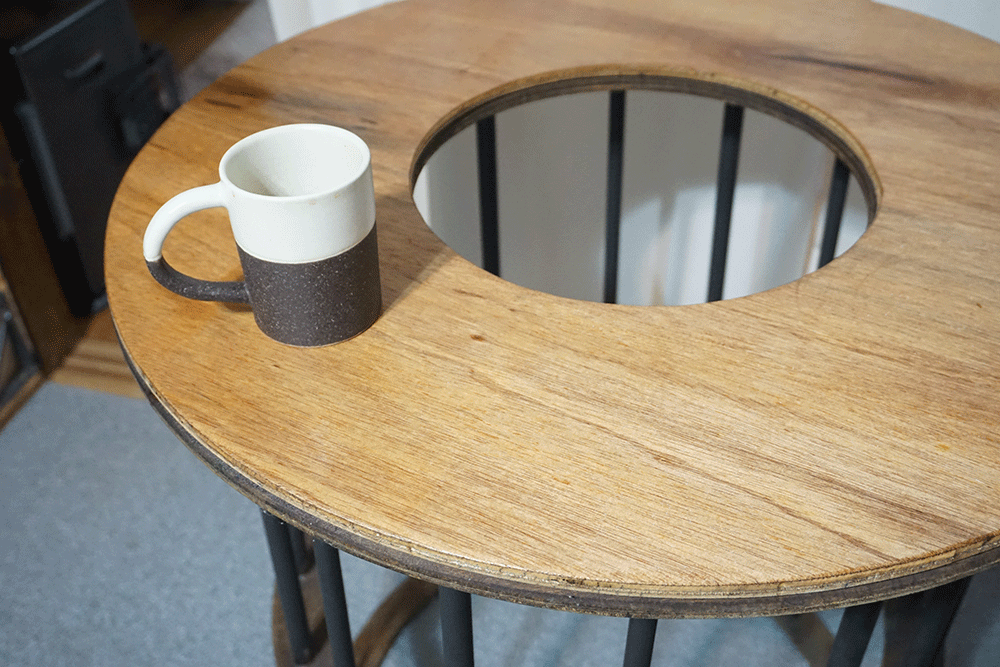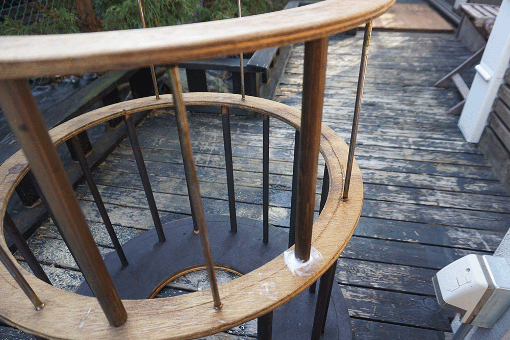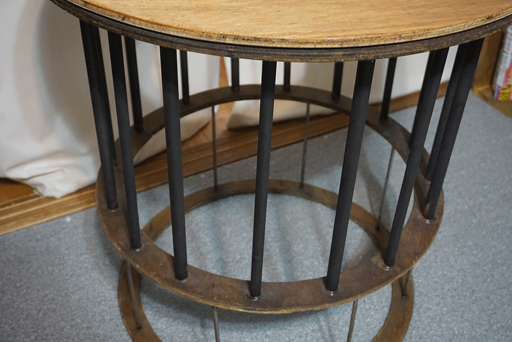 木の丸棒と天板はビスで固定しています。固定は、木の丸棒にあらかじめドリルで中心に穴を開け、ビスを打ち込んでも割れないように最新の注意を払い固定します。念のためボンドもつけていますがビスだけでも十分だと思います。