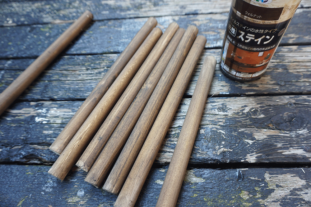 木材の丸棒はとても細くビス割れしやすいので、あらかじめドリルで穴を開けてからとめています。