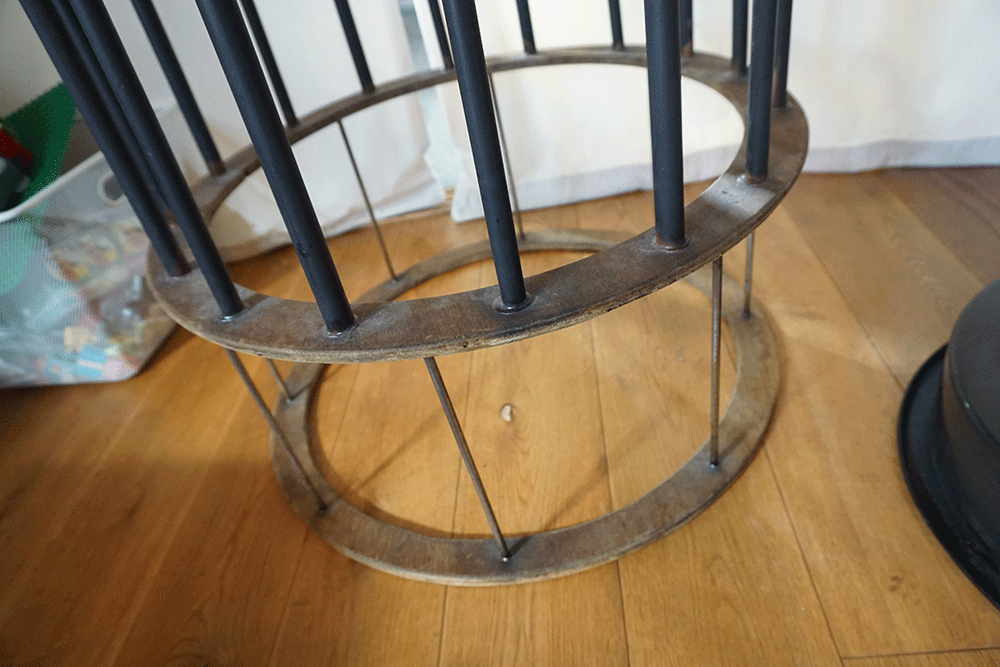 鉄の棒は、木材にタップダイスの加工器具で溝を作り、そこに固定しています!