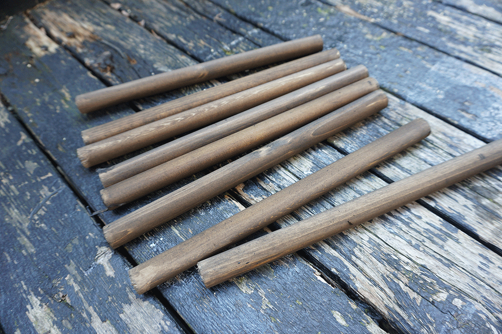 全ての木材がカットできたら着色。よく乾かして次は防炎用にスプレーを振りかけておきます。画像の黒い部分は防炎用スプレーをふりかけた場所。