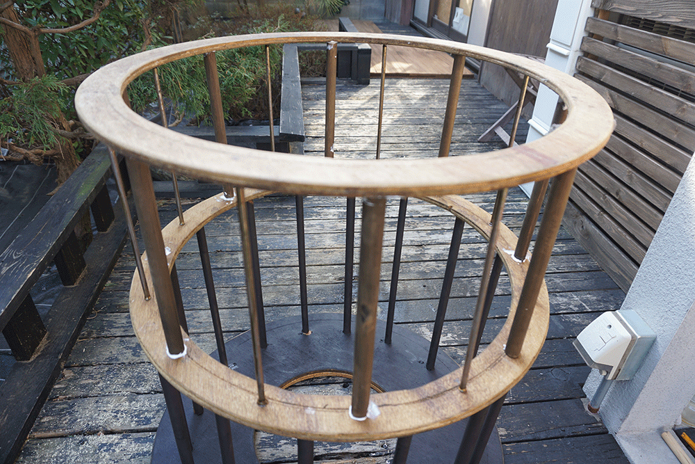 鉄の丸棒は、2段目の木の輪っかにねじ切りダイスと呼ばれる器具を使い溝を作ります。木にネジの受け皿を付けるイメージです。