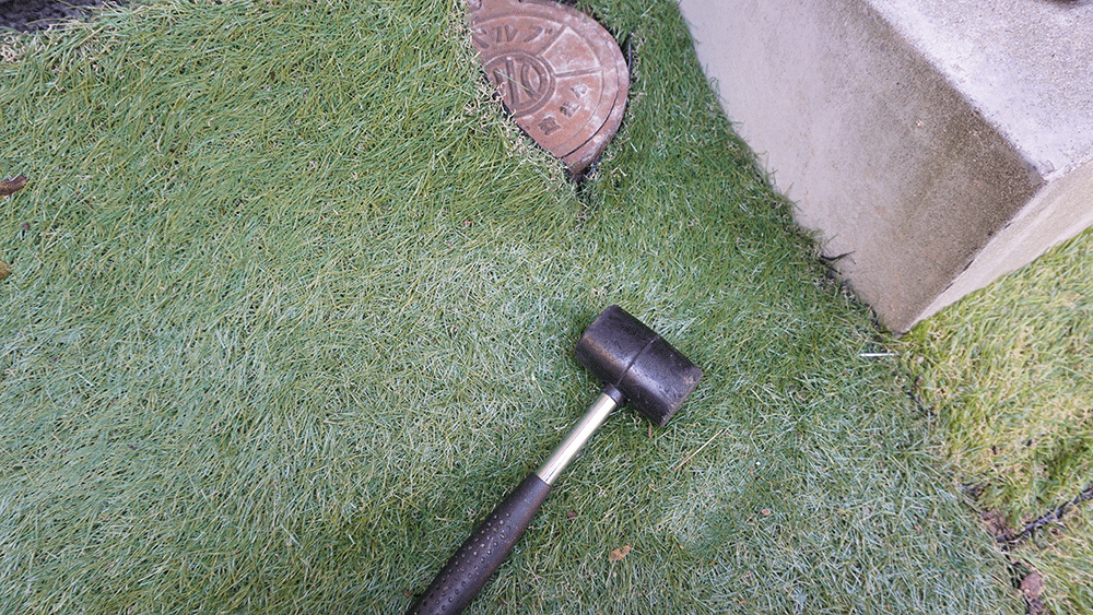 庭に人工芝を敷こうと思い、芝止めの杭を打ち込んでいたときのこと。