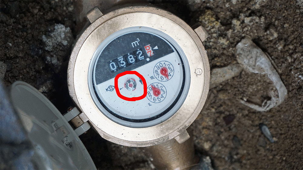 (赤丸で囲んだところが、水を使用していないにも関わらずクルクル回っていれば水が漏れているかもしれません)