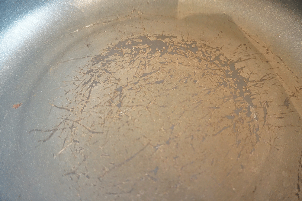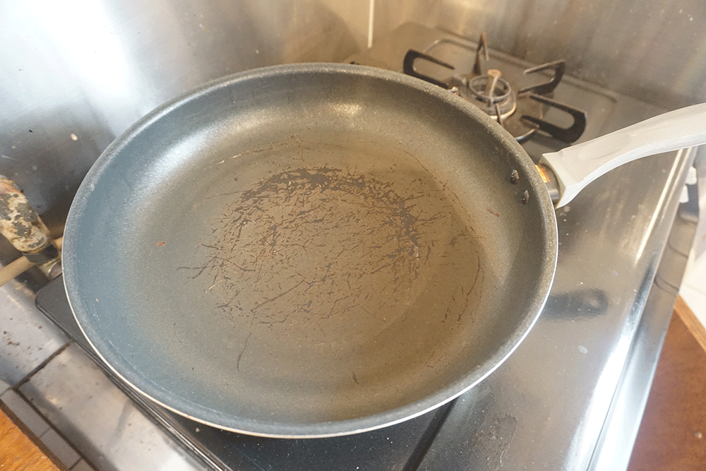 フライパンの表面は加工のされているものが剥がれてしまい、そこに料理が入り込み焼きつくので焦げ付いてしまいます。