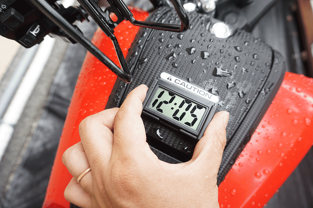 ケースと時計本体に分かれているので、ケースのみをバイクにつけておけば電池交換や雨の日など脱着が楽々です。
