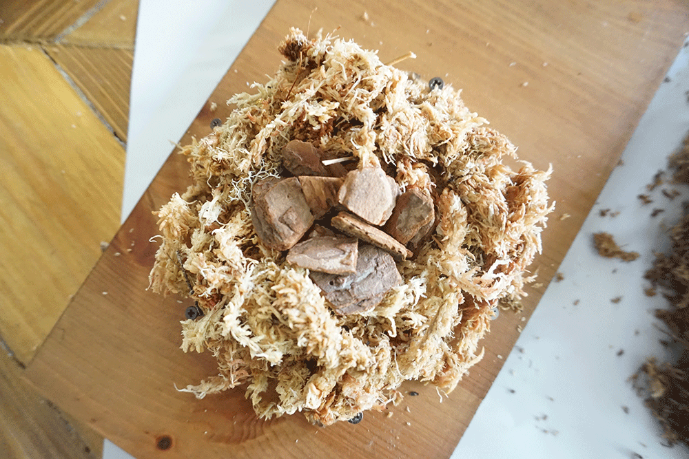 ビスを打ち終わったら、その囲いの中にミズゴケを敷いていきます。水気をしっかり取って(絞って)置いていきます。