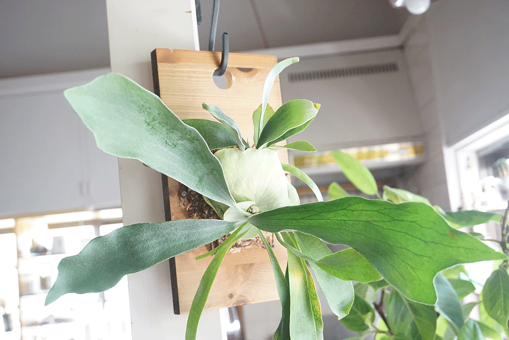 本来は他の樹木などに宿って生活する着生植物のビカクシダ。鉢植えよりも板付けの方が自然本来の形に近く、成長も良くなるのだとか。
